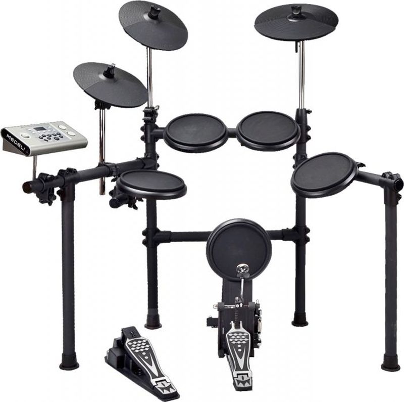 В цифровой ударной установке DD504D от Medeli присутствуют 35 комплектов ударных, 335 красивых голосов и двузонный малый барабан, что позволяет ударнику полностью выразить свой творческий потенциал. Барабаны не требуют много времени на регулировку и отлично подойдут начинающим исполнителям. Пэды по отклику приближаются к акустическим барабанам. С помощью двузонного малого барабана можно выполнять обычные удары и рим-шоты. В установке имеются впечатляющие звуки тарелок, барабанов и перкуссии. Просты в применении 24 встроенных комплекта, а 11 пользовательских дают возможность сгруппировать понравившиеся звуки вместе. С 60 предустановленными песнями, выходом под наушники и системой уроков модель DD504D выступает идеальным выбором для обучения. Подсоедините усилитель на линейный выход, портативный плеер к AUX-входу и играйте под мелодии вашей любимой группы. В установке DD504D с отличными пэдами и великолепным качеством звучания представлено всё необходимое для инструмента начального уровня. Характеристики модели DD504D: Установка располагает одним малым двузонным барабаном и тремя том-барабанами. Тарелки хайт-хэд, креш и райд. Под бас-барабан и хай-хэт имеются педали. Встроен дисплей ЖК. Максимальная полифония – 64. 335 голосов. Одна демо песня. Есть эффект реверберации. В наборах ударных 11 пользовательских и 24 встроенных. Для библиотеки предусмотрено 60 заранее установленных песен. Темп от 30 до 280. Встроен метроном. Размеры 1240x680x1410 мм. Вес 24,5 кг.