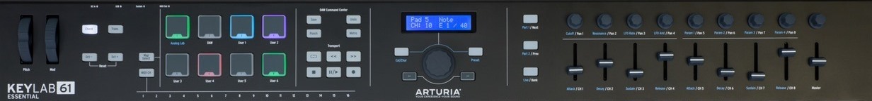 Arturia KeyLab Essential 61 Black Edition – мощная MIDI клавиатура в новом стильном дизайне, выпущенная ограниченным тиражом. Модель оснащена 61-клавишной клавиатурой, обладает эргономичным, интуитивно понятным интерфейсом управления, включающим поворотные регуляторы, кнопки, пэды и фейдеры, которые автоматически ассоциируются с основными функциями приложений для обработки аудио материала, и обеспечивает удобство работы в программном обеспечении. Протоколы MCU/HUI делают клавиатуру совместимой практически с любым записывающим оборудованием, позволяя полностью сосредоточиться на творчестве. KeyLab Essential Black позволяет работать над созданием музыки и аранжировками, а также играть, сохраняя Вашу привычную, проверенную временем технику. Клавиатура также очень удобна для живых выступлений. Пэды оснащены подсветкой, а экран, на котором отображаются основные параметры, хорошо читаем при любом освещении. В комплекте поставляется комплект программного обеспечения, в том числе Analog Lab 3 собственной разработки Arturia, предоставляющий доступ к более чем 6500 звуков клавишных инструментов и синтезаторов, а также Ableton Live Lite.