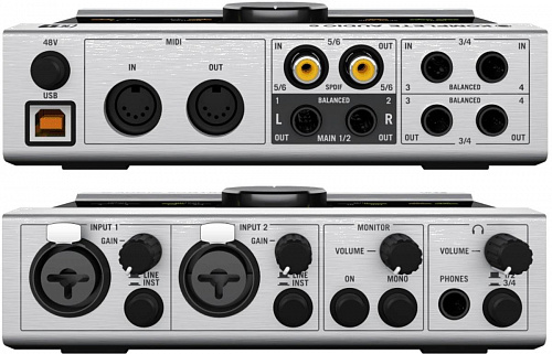 - Входы: 4 аналоговых входа: 2 балансных комбинированных (XLR/TRS), плюс 2 симметричных линии (1 / 4 " TRS), цифровой стерео вход (S / PDIF / RCA), MIDI вход
